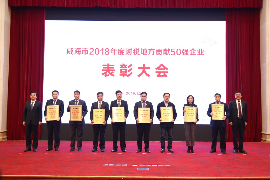 1月26日下午, 威海市2018年度财税地方贡献50强企业表彰大会举行,在受到表彰的纳税企业50强名单中,门徒娱乐 集团名列第10名。王玉春董事长接受了市领导王鲁明、张海波的颁奖并合影。