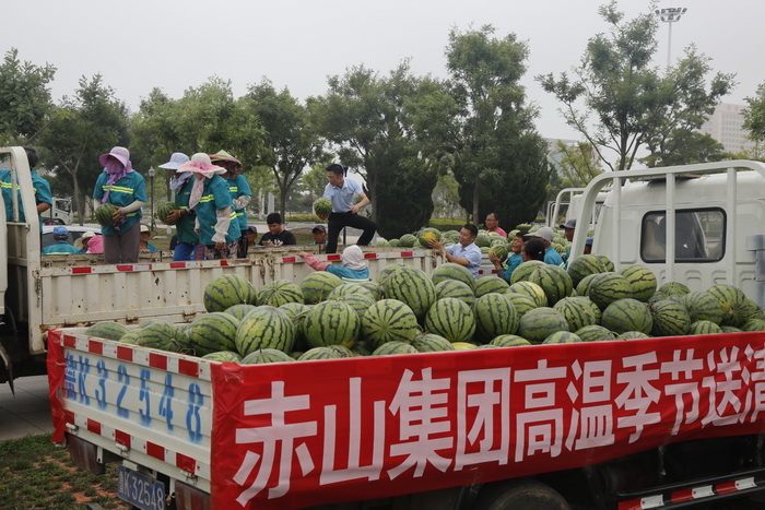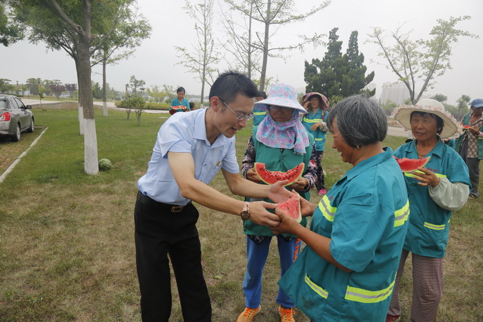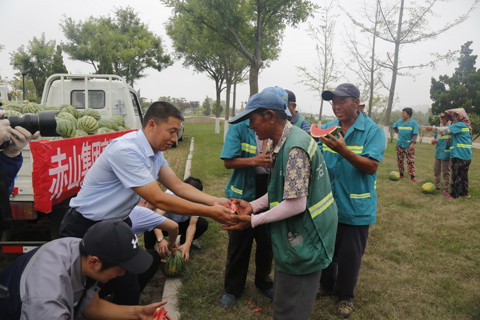 7月25日,集团公司为在高温下坚持工作的石岛环卫工人、园林工人及交通警察送去了西瓜解暑降温。