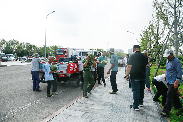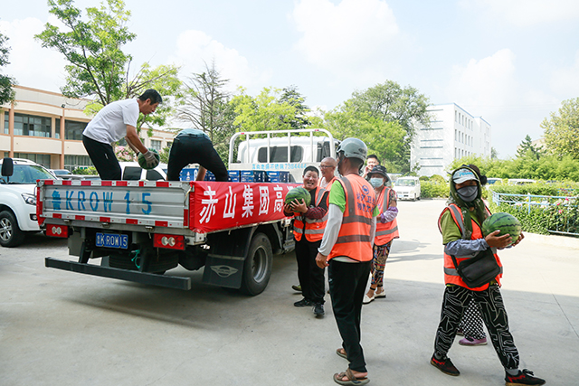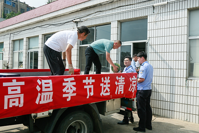 集团组织开展送清凉活动,为石岛管理区园林、环卫、交警这些单位高温下坚持工作的一线工作者送去西瓜和矿泉水等解暑物资,对他们的辛勤付出表示感谢和慰问。