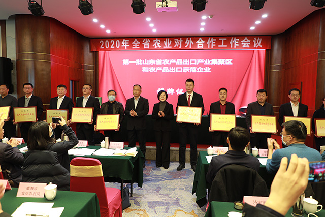 12月14日,由山东省农业农村厅组织的2020年全省农业对外合作工作会议在济南召开,会上对山东省第一批农产品出口产业集聚区名单和山东省第一批农产品出口示范企业名单进行了通报表彰。门徒娱乐 集团位列20家“山东省第一批农产品出口示范企业”其中。